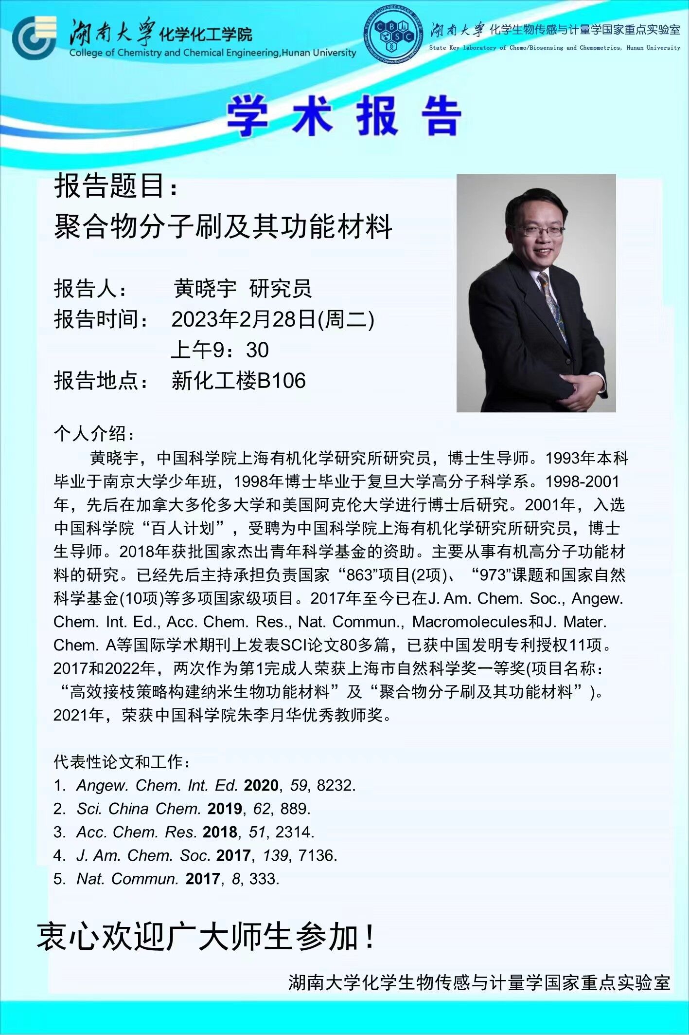 学术地点 新化工楼B106 主讲人 黄晓宇研究员