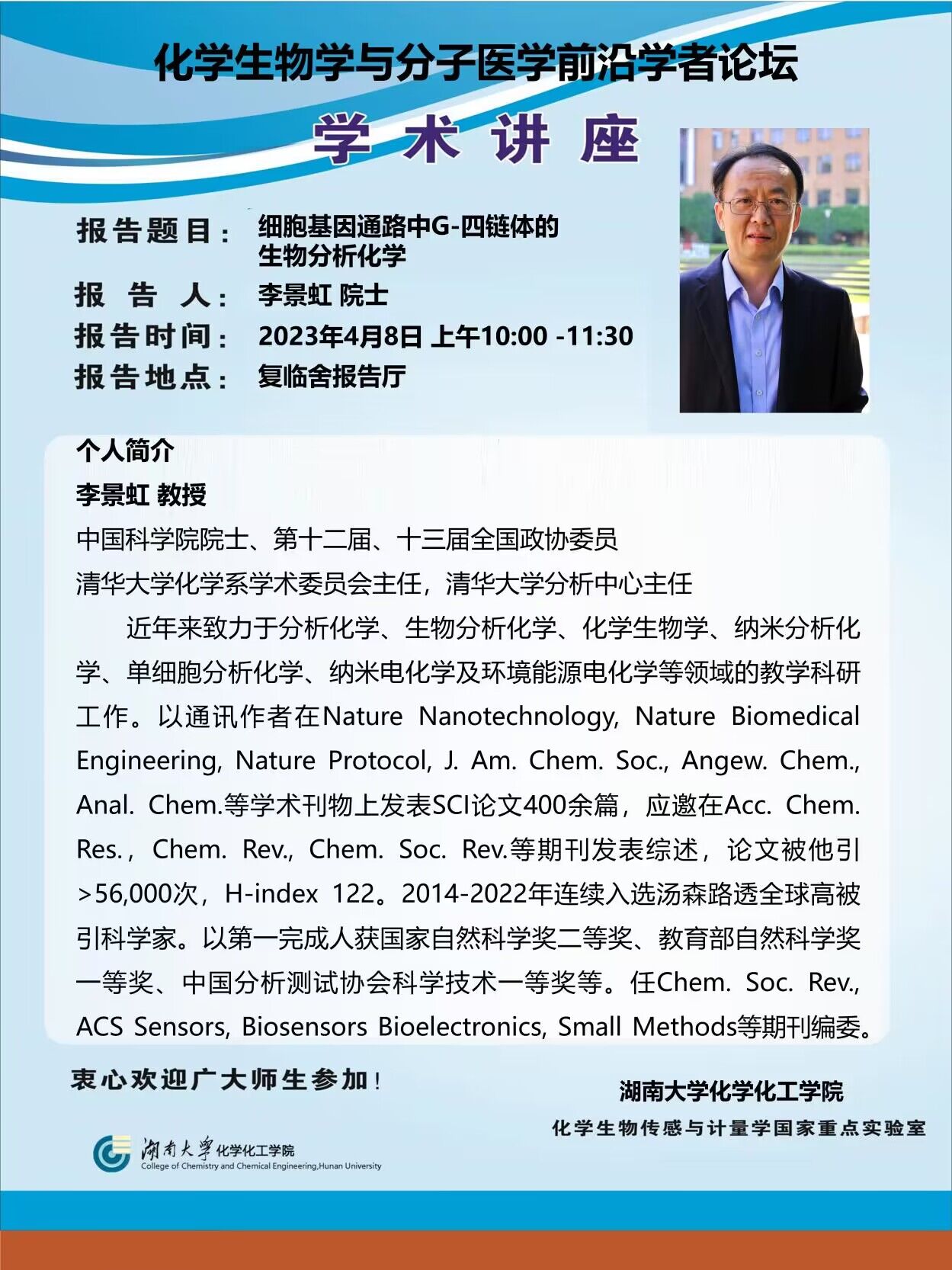 学术地点 复临舍报告厅 主讲人 李景虹教授 中国科学院院士