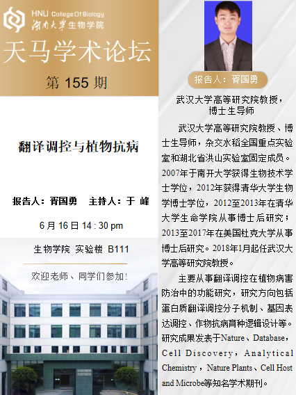 学术地点 生物学院实验楼B111 主讲人 胥国勇