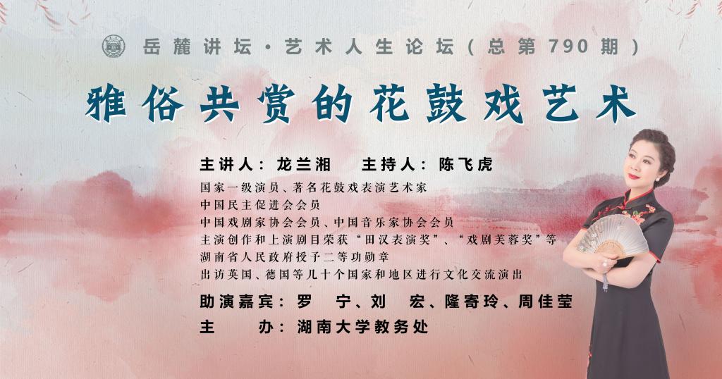 主讲人:龙兰湘(国家一级演员,著名花鼓戏表演艺术家,中国民主促进会会员,中国戏剧家协会会员、中国音乐家协会会员,主演创作和上演剧目荣获《田汉表演奖》《戏剧芙蓉奖》等奖项,湖南省人民政府授予二等功勋章,出访英国、德国等几十个国家和地区进行文化交流演出)