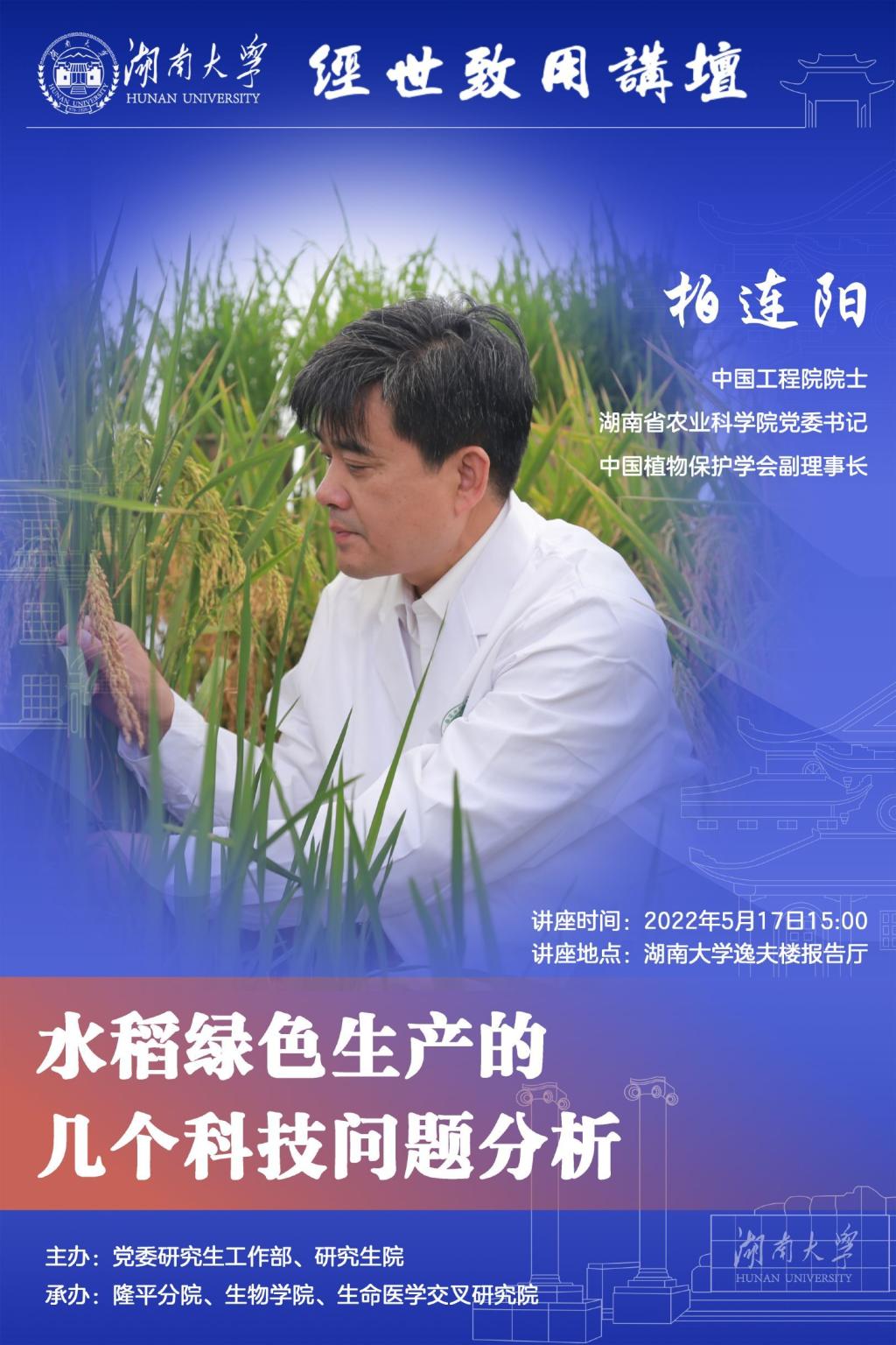 5月17日15:00邀请中国工程院院士、湖南省农科院党委书记柏连阳老师莅临sunbet申搏官方网站逸夫楼报告厅作“水稻绿色生产的几个科技问题分析”主题报告,欢迎同学们前来聆听。
