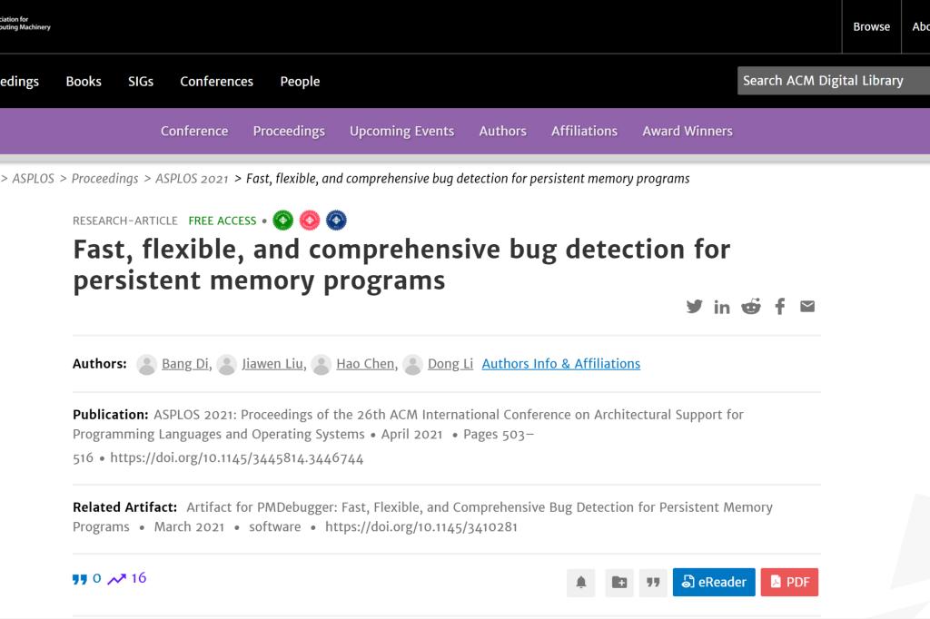 2021/04/25信科院课题组在持久性内存储存研究方面获得新进展近日,信息科学与工程学院陈浩教授课题组在持久内存研究领域取得新进展,博士生狄棒的论文“Fast, Flexible, and Comprehensive Bug Detection for Persistent Memory Programs”在计算机系统领域顶级国际会议ACM... -
